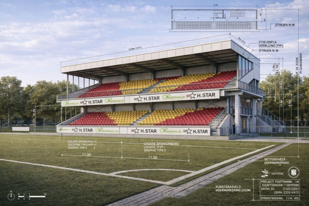 Sinds het unanieme raadsbesluit op 5 juni 2025 is het project in een stroomversnelling geraakt. Het oorspronkelijke plan – de volledige sloop en nieuwbouw van de verouderde kleedkamers en kantine – is in de afgelopen maanden verder verfijnd. In het nieuwe ontwerp blijft alleen het huidige tribunegebouw behouden, maar dit wordt nu uitgebreid met een extra verdieping.